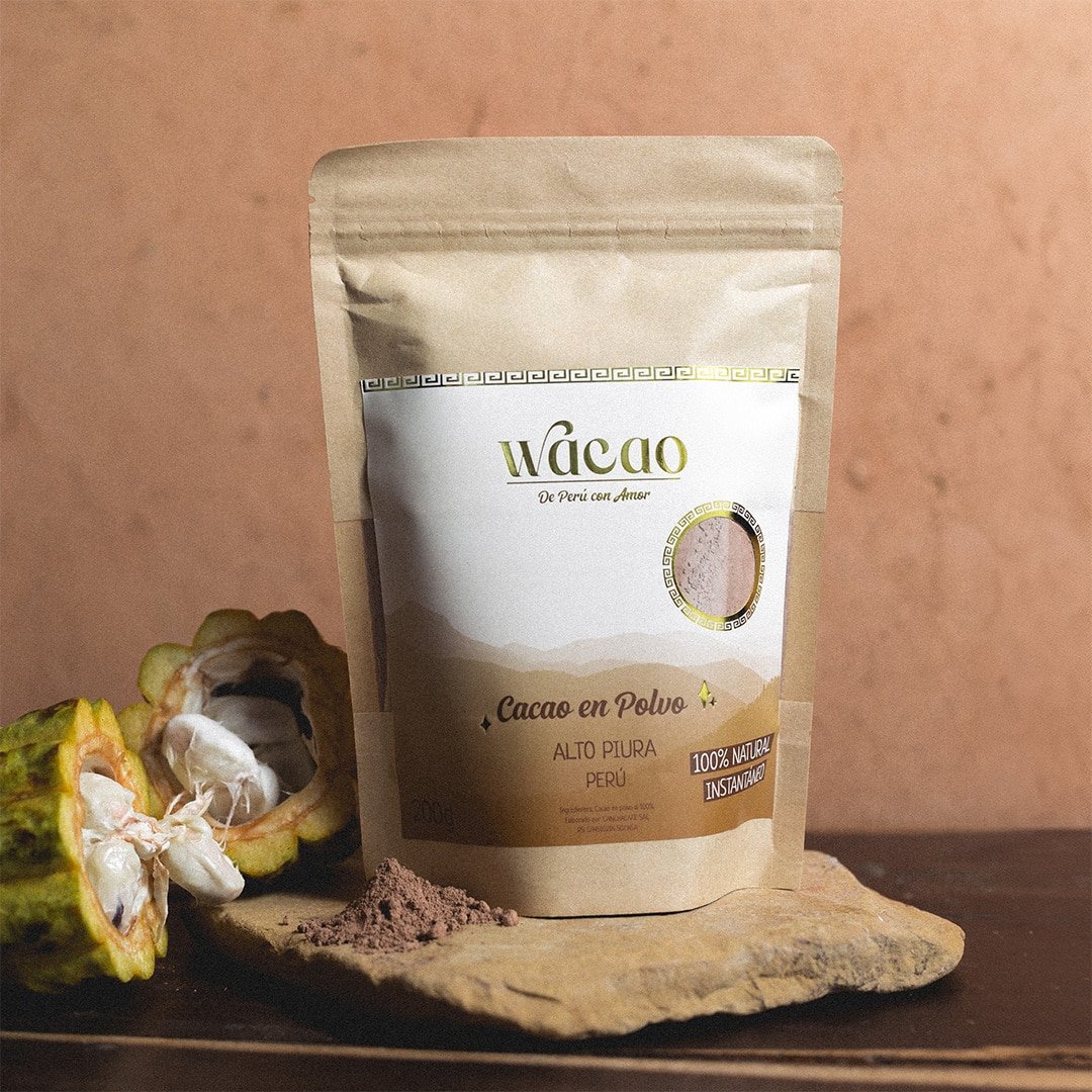 Descubre Wacao, nuestro cacao en polvo 100% instantáneo, directamente desde las fértiles tierras del Alto Piura, Perú. Elaborado con granos de cacao criollo de la más alta calidad, Wacao es la elección perfecta para aquellos que buscan un sabor auténtico y puro en sus preparaciones.